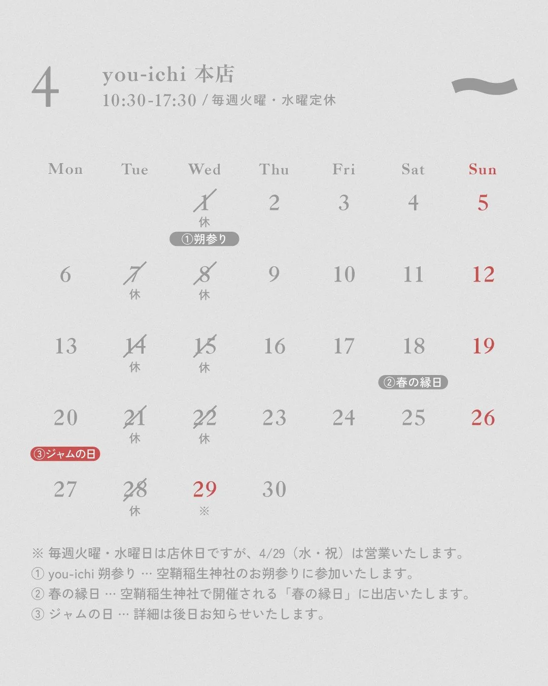営業時間:10:30-17:30(隔週火曜・毎週水曜定休日)※下部の営業カレンダーをご参照ください